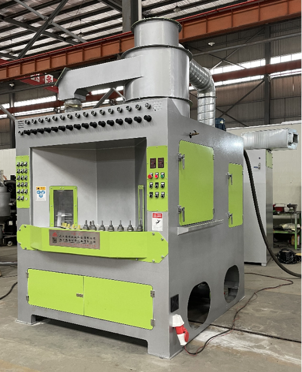 該自動噴砂機(jī)(可按客戶要求定制),主要用于處理回轉(zhuǎn)體工件的自動噴砂機(jī),設(shè)1個(gè)大轉(zhuǎn)盤,大轉(zhuǎn)盤上設(shè)置8個(gè)小轉(zhuǎn)盤,針對小直徑工件可在小轉(zhuǎn)盤上設(shè)置復(fù)合多工位小轉(zhuǎn)盤,本機(jī)共分4個(gè)區(qū),分別為上下件區(qū)、第一隔離區(qū)、噴砂區(qū)、第二隔離區(qū)(吹凈區(qū)),每個(gè)區(qū)設(shè)兩個(gè)小轉(zhuǎn)盤,大轉(zhuǎn)盤轉(zhuǎn)動90°區(qū)域一停,工件由上下件區(qū)裝夾在小轉(zhuǎn)盤上,大轉(zhuǎn)盤轉(zhuǎn)動帶動小轉(zhuǎn)盤和工件進(jìn)入噴砂區(qū),小轉(zhuǎn)盤在噴砂區(qū)自動旋轉(zhuǎn),噴槍往復(fù)擺動或移動對工件進(jìn)噴砂加工,保證了工件噴砂均勻;配置我公司多年經(jīng)驗(yàn)專業(yè)設(shè)計(jì)的上旋風(fēng)分離器,分離效果好,精度高,無級可調(diào);配置獨(dú)立的氣動振打清灰布袋除塵器,也可根據(jù)用戶要求配置下沉流脈沖反吹清灰濾筒除塵器除塵效果好,達(dá)到國家環(huán)保排放標(biāo)準(zhǔn);本機(jī)采用成熟可靠的先進(jìn)技術(shù)